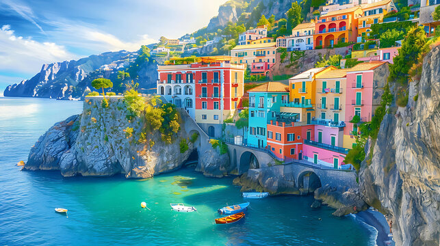Aerial view of Amalfi Coast, Italy, colorful houses on cliffside overlooking the Mediterranean Sea, travel amalfi coast italy illustration landscape sea. Generative AI illustration
