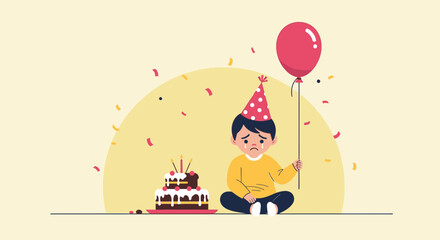 Upset Child On Birthday Holding Balloon Next To Birthday Cake Illustration