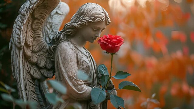 A sorrowful angel with downcast eyes holding a single red rose in their hand symbolizing the fleeting nature of life.