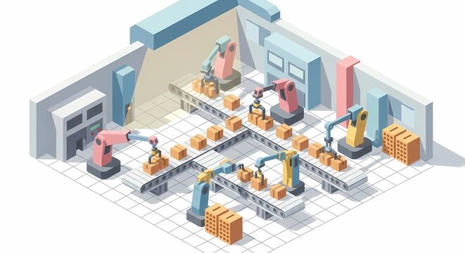 Automated Assembly Line: Robotic Arms Sorting Packages on Conveyor Belts