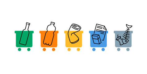 Waste sorting pictogram set - garbadge separation dumpster marking stickers - glass, plastic, metal, paper, organic waste