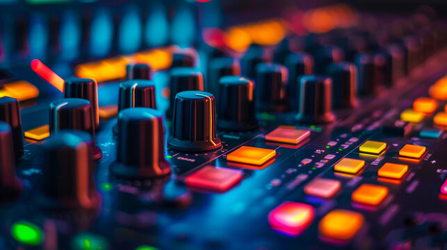 Sound Mixing: Capture the energy of a dynamic sound system and mixing console with glowing buttons, lights, and faders, designed for a lively musical performance.