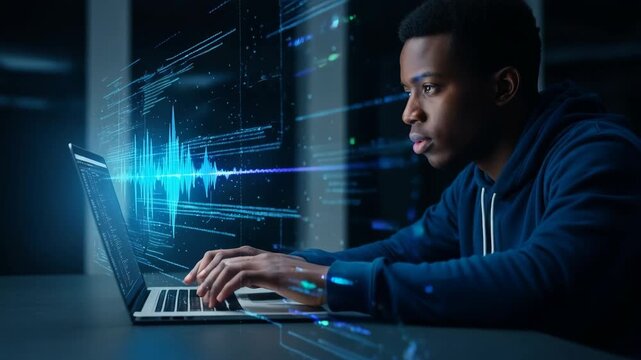 Young black male programmer in a hoodie working on a laptop, with vibrant sound wave visualization and coding interface, illustrating modern technology and digital creativity