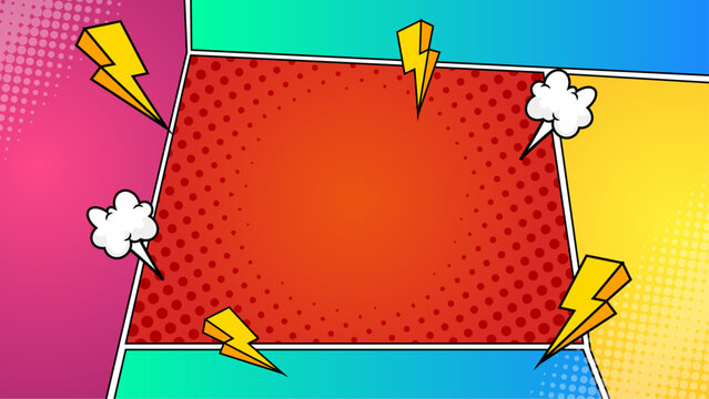 Colorful comic book panel with speech bubbles and lightning bolts. Great for comic book illustrations, graphic novels, superhero themes, and storytelling.