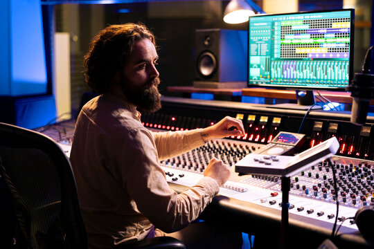 male producer, sound engineer hands working on audio mixing console in broadcasting, recording studio