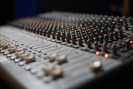 Close-up view of a professional sound mixing console with various knobs and sliders in a recording studio.