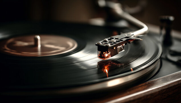 Vinyl Symphony: A vintage turntable spins a black vinyl record, with musical notes dancing gracefully into the air, evoking a sense of nostalgia and the pure joy of music.
