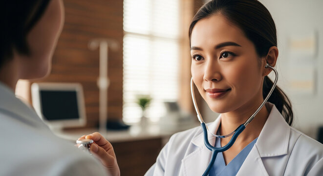 Doctor in white coat records podcast with professional microphone, stethoscope. Medical professional speaks into mic, holds paper with notes. Modern audio equipment in studio setting. Healthcare