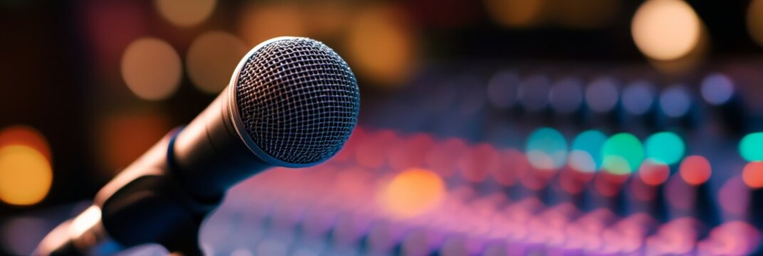 A close-up shot of a microphone with a blurry soundboard in the background. The microphone is in focus, while the soundboard is out of focus. The image symbolizes communication, performance, and the p