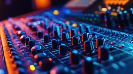 Close-up of a futuristic DJ mixer.  Detailed control panel with vibrant neon lighting