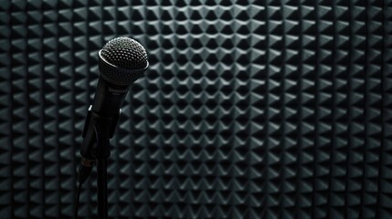 Professional microphone on black soundproof panel background in recording studio with space for text