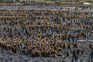 Sunrise on king penguins (Aptenodytes patagonicus) at nesting and breeding colony at Salisbury Plain, South Georgia, Polar Regions