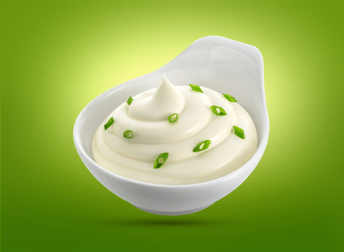 Bowl of tasty sour cream with sliced green onion and potato chips on blue background