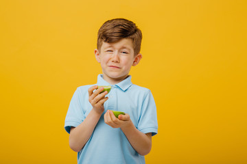 beautiful boy taste a fresh lime taste sour grimace, facial emotions negative, in blue T-shirt, isolated yellow background, copy space