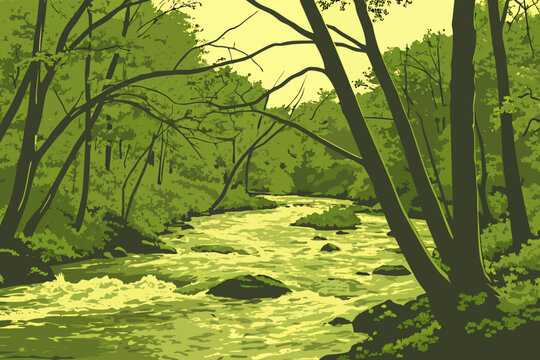 Overflowing creek in southeastern Illinois pushing through a forested area, tree trunks partially submerged as water surges downstream