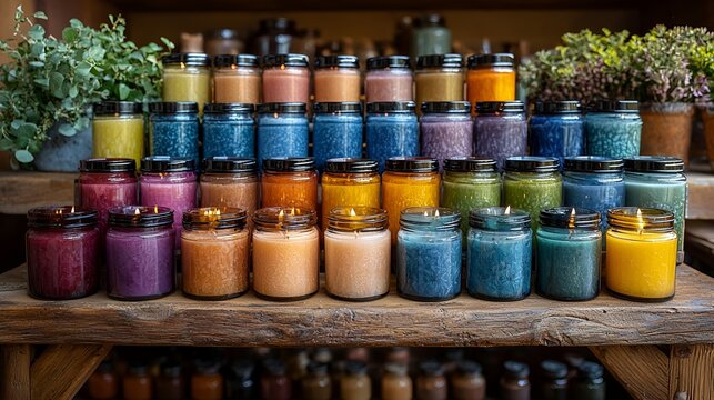 Colorful scented candles arranged on a wooden table in a cozy shop illuminated by warm lighting