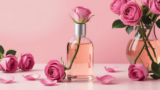 Elegant still life of a rose-infused perfume bottle amidst fresh pink blooms and delicate petals, exuding a luxurious floral aroma on a soft pastel background