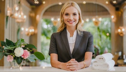 spa ambiance Receptionist with a friendly demeanor welcomes visitors