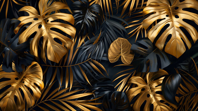 Tropical leaves gold and black, Dark Monstera, palm graphic design, Minimal summer abstract jungle forest pattern, exotic botanical design cosmetics