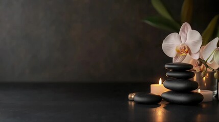 black massage stones, orchid flower, and candles on a dark background, The spa scene white towels arranged on top of smooth stones, relaxation and self-care