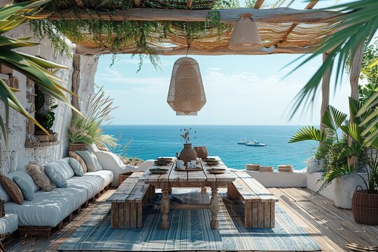 Coastal bohemian outdoor dining area with relaxed seating and beachy vibes.