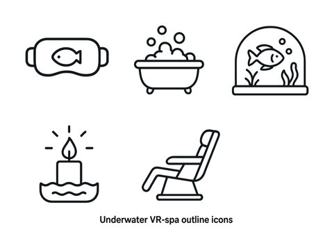 Underwater vr spa outline icons: fish tank, relaxation chair, candle, bathtub