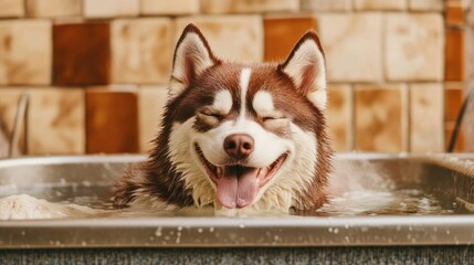 A husky relaxes in a grooming tub, soaking up warm sunlight and enjoying the water