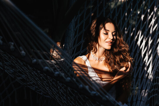 Attractive young woman is relaxing outdoor while lying in hammock. Beauty treatment concept.