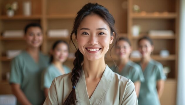 Smiling spa salon receptionist, dressed in white uniform, welcoming clients. Happy female staff member in beauty center, wellness treatment at resort. Service, client oriented spa day. Portrait.