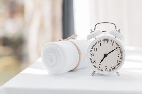 Alarm clock, white towels on white wooden table with copy space blurred background. Beauty concept with beautiful spa composition set.