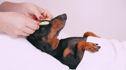 professional massage therapist strokes his head with fingers dog dachshund, black and tan, relaxed from spa procedures on face with cucumber, covered with a towel