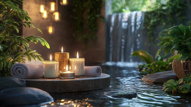 Soft pink spa scene with candles, towels, and flowers creates a serene atmosphere, AI