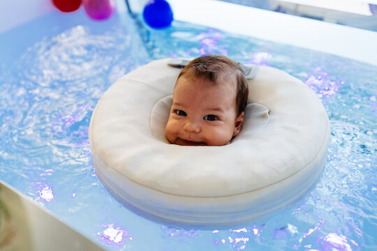 Small child or a baby is swimming and having a pleasant time during a physical therapy session in the pool. Baby is looking at camera and smiling.