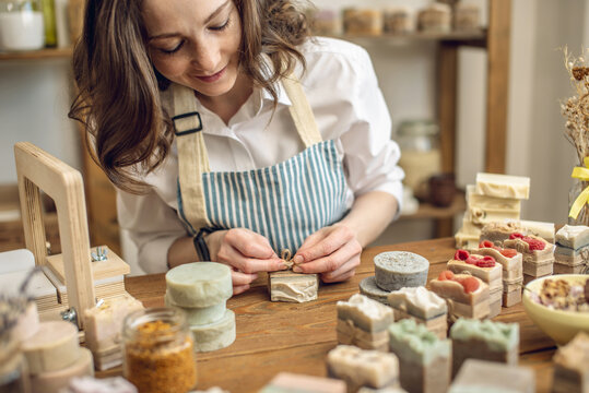Woman soap maker in a workshop is packing handmade natural soap. Cozy creative atmosphere and nice hobby