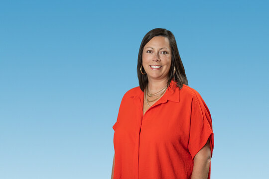 Headshot of Caucasian brunette middle age business woman in studio on blue backdrop with copy space