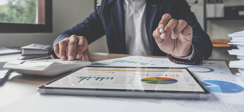 Cropped shot of businessman using digital tablet writing business plan, sitting at office desk, copy space.