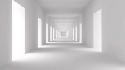 Futuristic white corridor with symmetrical architecture, soft lighting, and deep perspective. Ideal for tech, architecture, or conceptual design themes in commercial use.