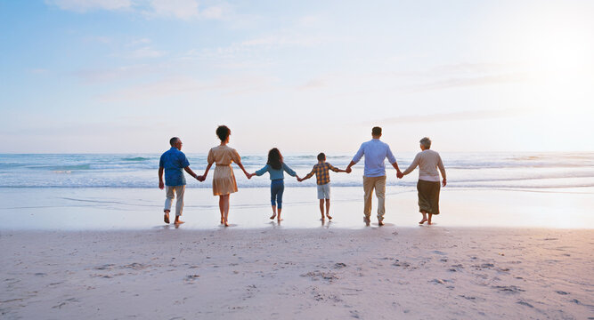 Big family, walk and holding hands with children on beach for summer holiday, travel and bonding. Space, back and parents with kids for ocean journey, tropical vacation and getaway adventure for trip