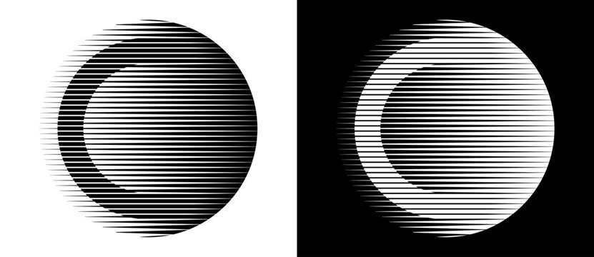 Transition parallel lines in circles. Abstract art geometric background for logo, icon, tattoo. Black shape on a white background and the same white shape on the black side.