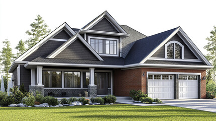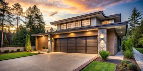 Modern luxury home exterior, elegant design, spacious driveway, landscaped yard