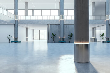 Modern spacious interior with two floors, windows, daylight. 3D Rendering.