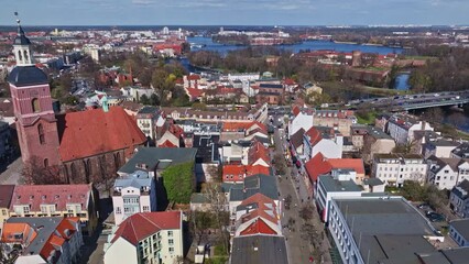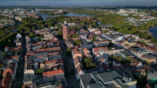 Berlin Spandau old town with its red rooftops, churches, and surrounding greenery. Lovely aerial view flight static tripod hovering drone