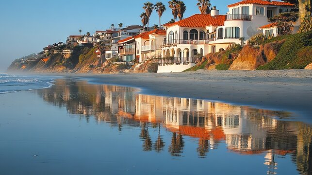 Reflection of palm trees and spanish style architecture in the water on the beach at low tide in San Clemente California with contrasting hues of turquoise and orange
