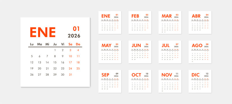 2026 calendar modern classic on Spanish language. Week starts on Monday. Desk or wall calendar in minimalist style