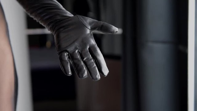 Female hit her hand in leather black glove with stack. Woman spank her hand palm with crop whip.