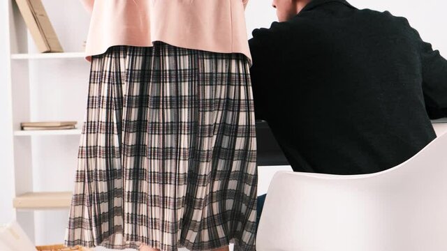 Harassment at work, subordinate and boss. Young male boss sexually assaults his secretary, grabbing her ass when she brought him documents to his desk. Rear view, slow motion, 4k