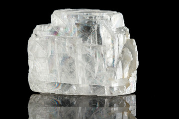Optical Calcite from China isolated on a black mirror background. Alternative stone name: Iceland Spar.