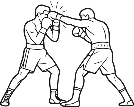 boxing match line drawing male fighters throwing punches defensive guard gloves shorts athletic action vector
