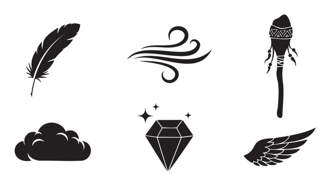 Collection of black silhouette icons representing natural and mystical elements like a feather, wind, cloud, wing, a sparkling diamond, and a tribal scepter