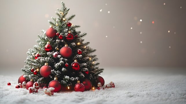 A beautifully decorated Christmas tree stands in a warm indoor space, adorned with red ornaments and sparkling lights, surrounded by gifts and festive decorations on soft white snow.